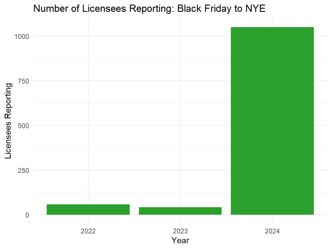 1. Visibility and Compliance Drive Growth The 2024 leap in licensee reporting underscores how CCRS adoption and POS automation have matured. What was once a partial sample is now a comprehensive dataset.