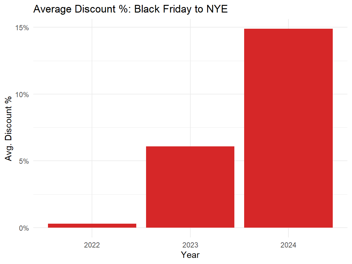 The escalation from <1 % to >19 % average discounts indicates the industry’s pivot toward retail economics — holiday promotions, bundling, and loyalty-based pricing.