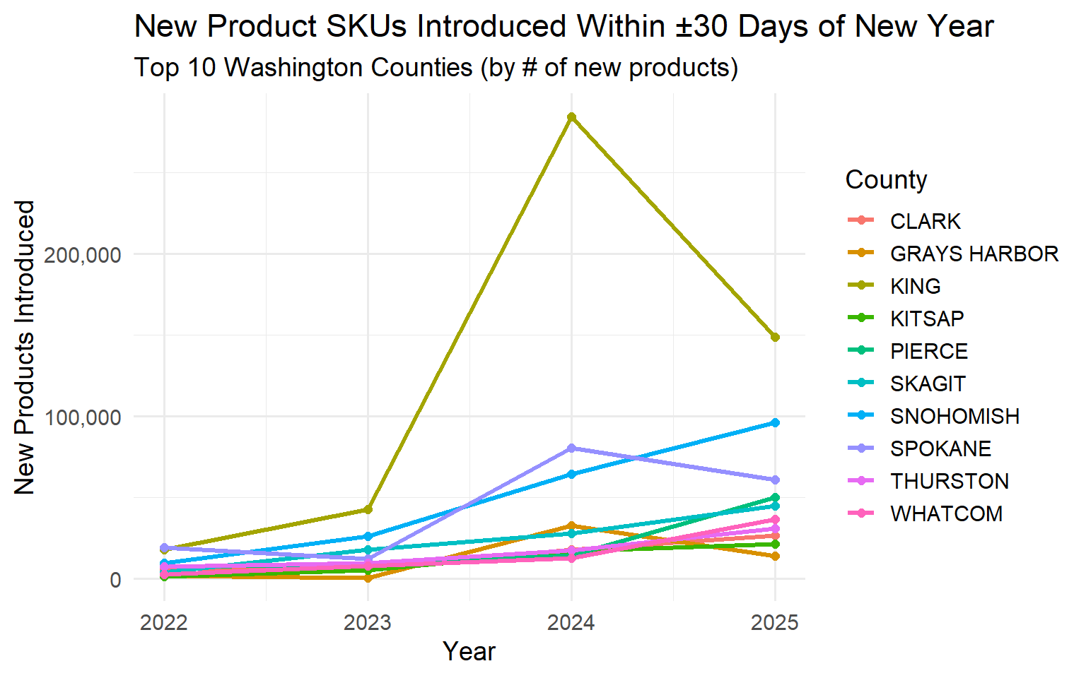 From 2021 to 2025, new product introduction rates rose sharply — but not uniformly. The visualization tracks top 10 Washington counties by number of new SKUs introduced within ±30 days of the New Year (a strong proxy for market-entry timing).