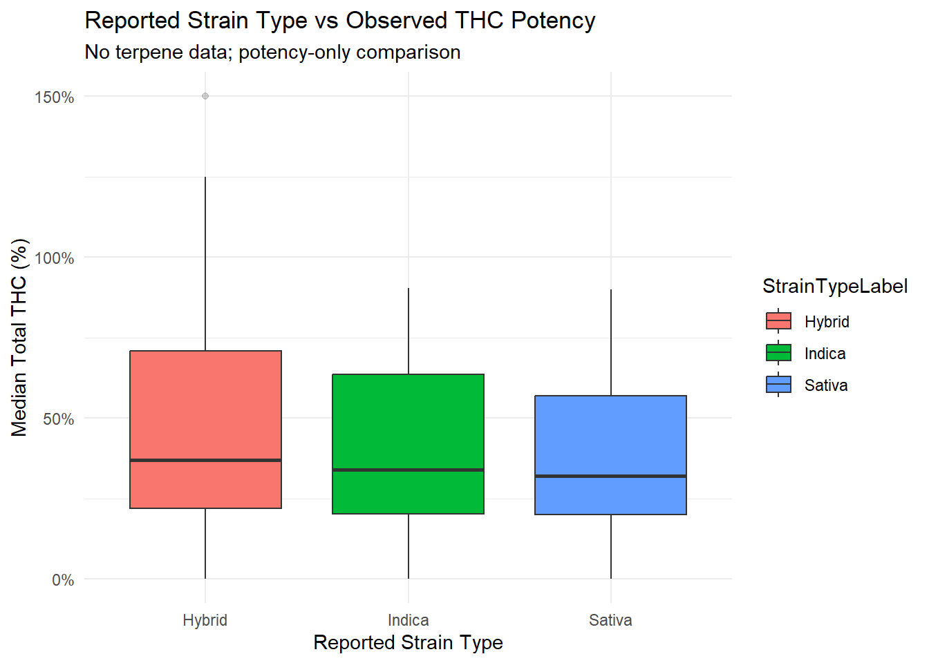 Reported strain type does not meaningfully predict THC potency, especially once concentrates are included.