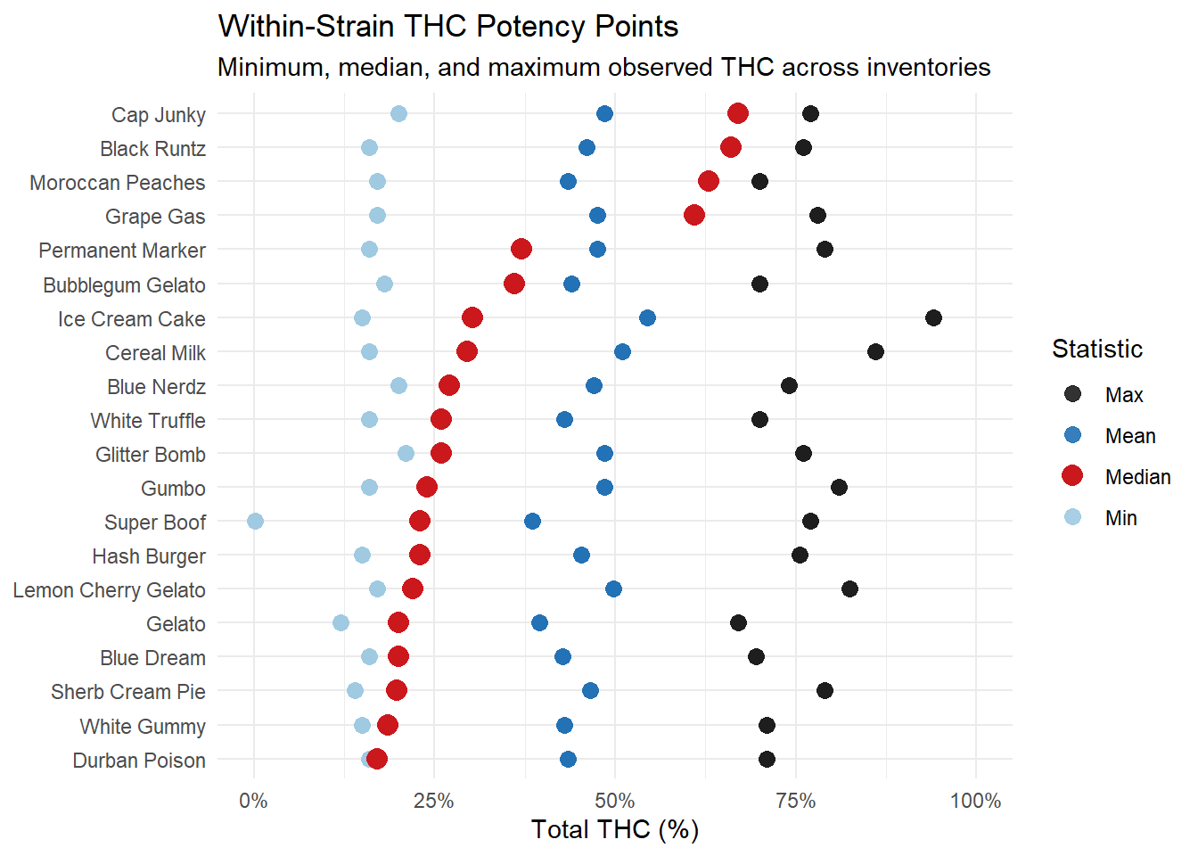 Within the same strain name, observed THC potency can vary dramatically, often spanning flower-level to concentrate-level ranges.