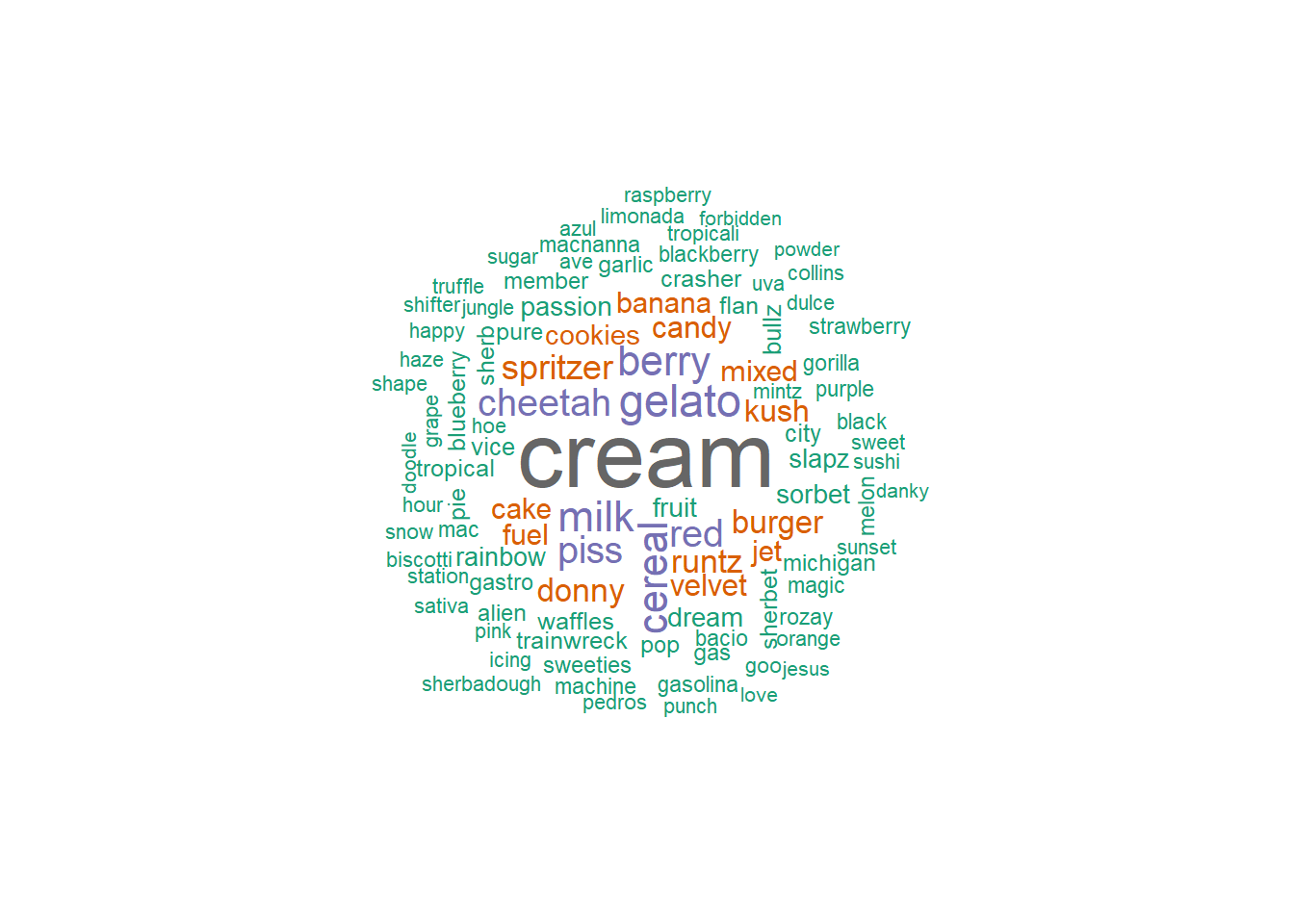 Word cloud analysis of strain names associated with the “Aroused” effect reveals heavy emphasis on: