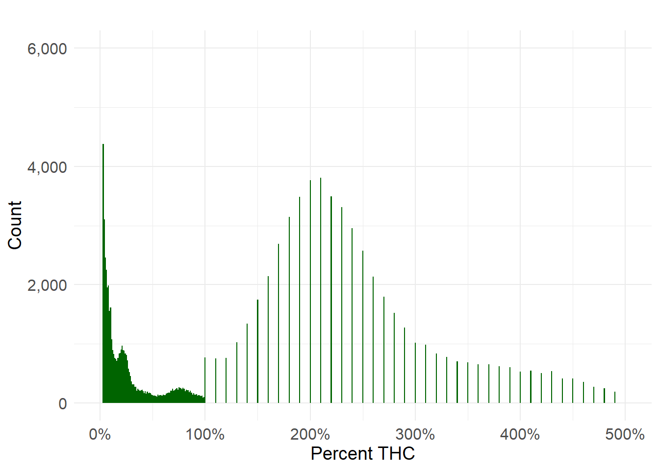 Values above 100% THC are only possible for concentrates, where THC can exceed 800 mg/g (80%). However, CCRS records include results up to 500%, indicating misreporting or pre-standardization unit confusion.