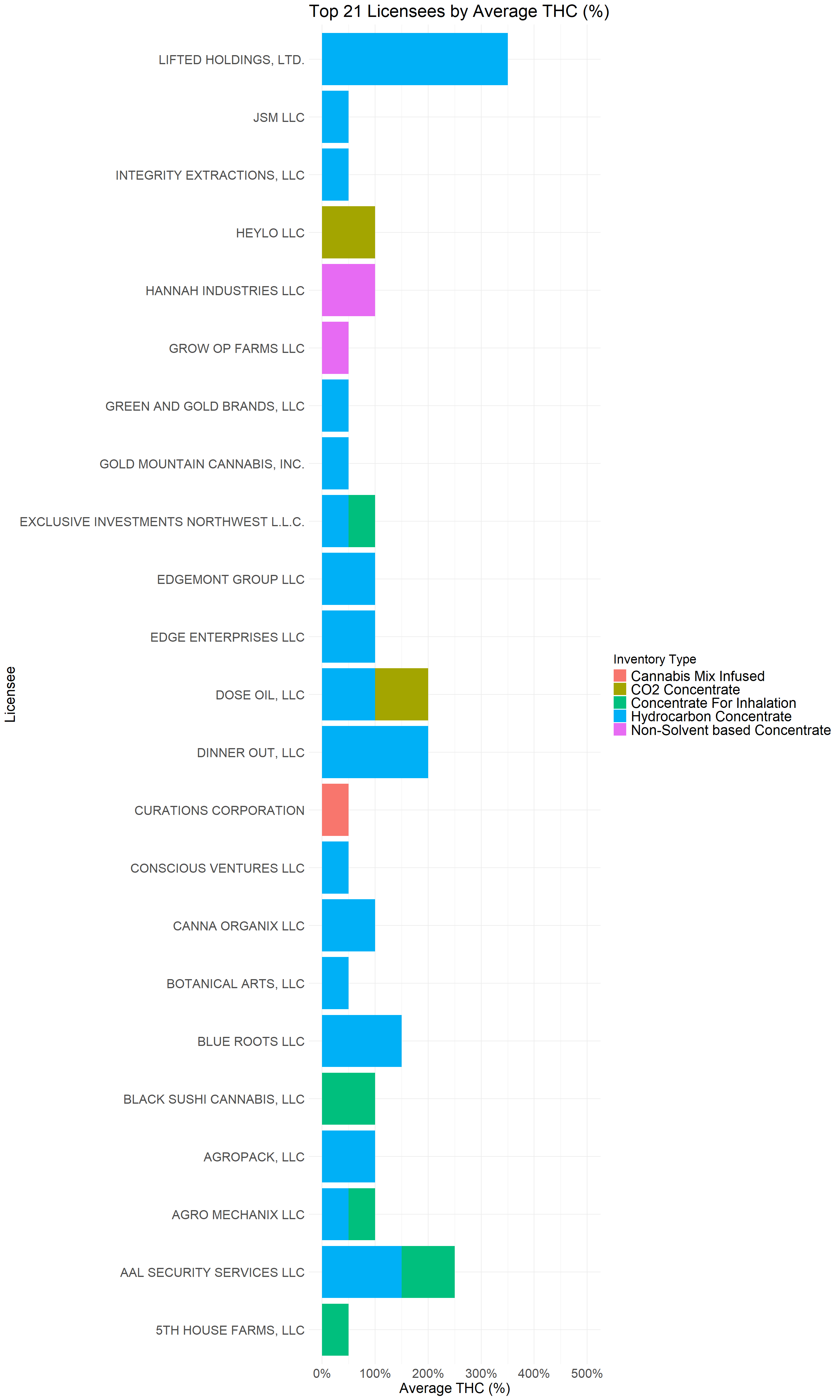 Many licensees repeatedly produce avg THC = 50% across hundreds or thousands of tests.