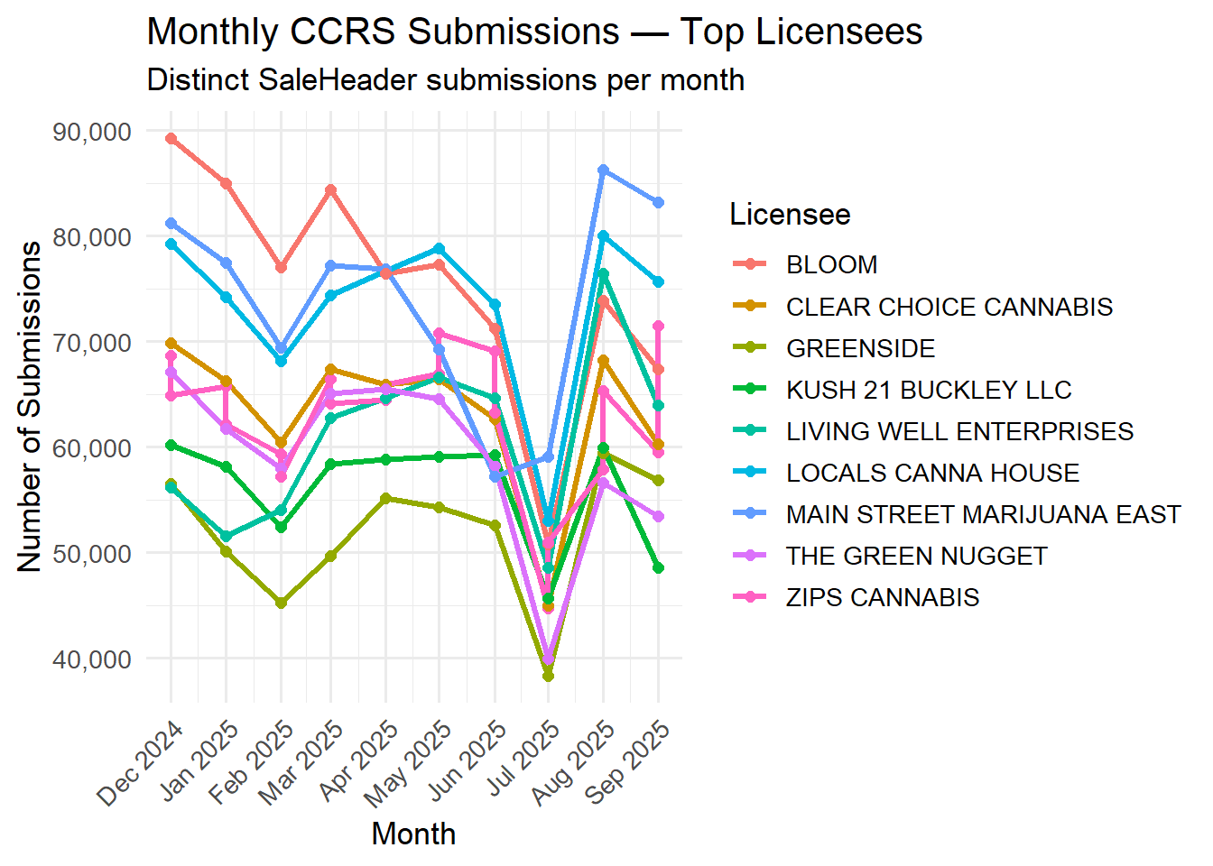 Instead, it evaluates licensee behavior directly, using distinct SaleHeader submissions as the atomic unit of CCRS interaction. This avoids inflation from record edits, corrections, or administrative churn and ensures that every submission counted represents a discrete compliance event.