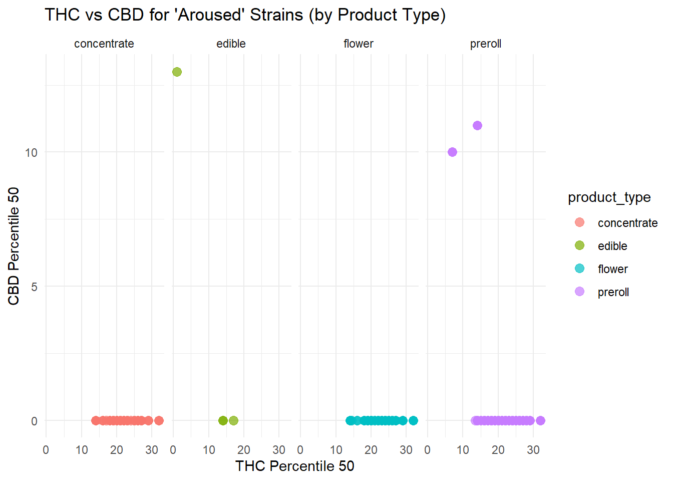 To illustrate how chemistry and product form interact within a specific experiential category, we examined strains labeled with “Aroused” as their primary effect.