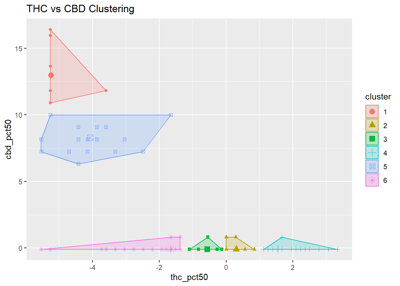 While six clusters were used for visualization, the practical result is straightforward: most strains collapse into high-THC / near-zero-CBD groupings, with only a small fraction exhibiting elevated CBD percentiles.