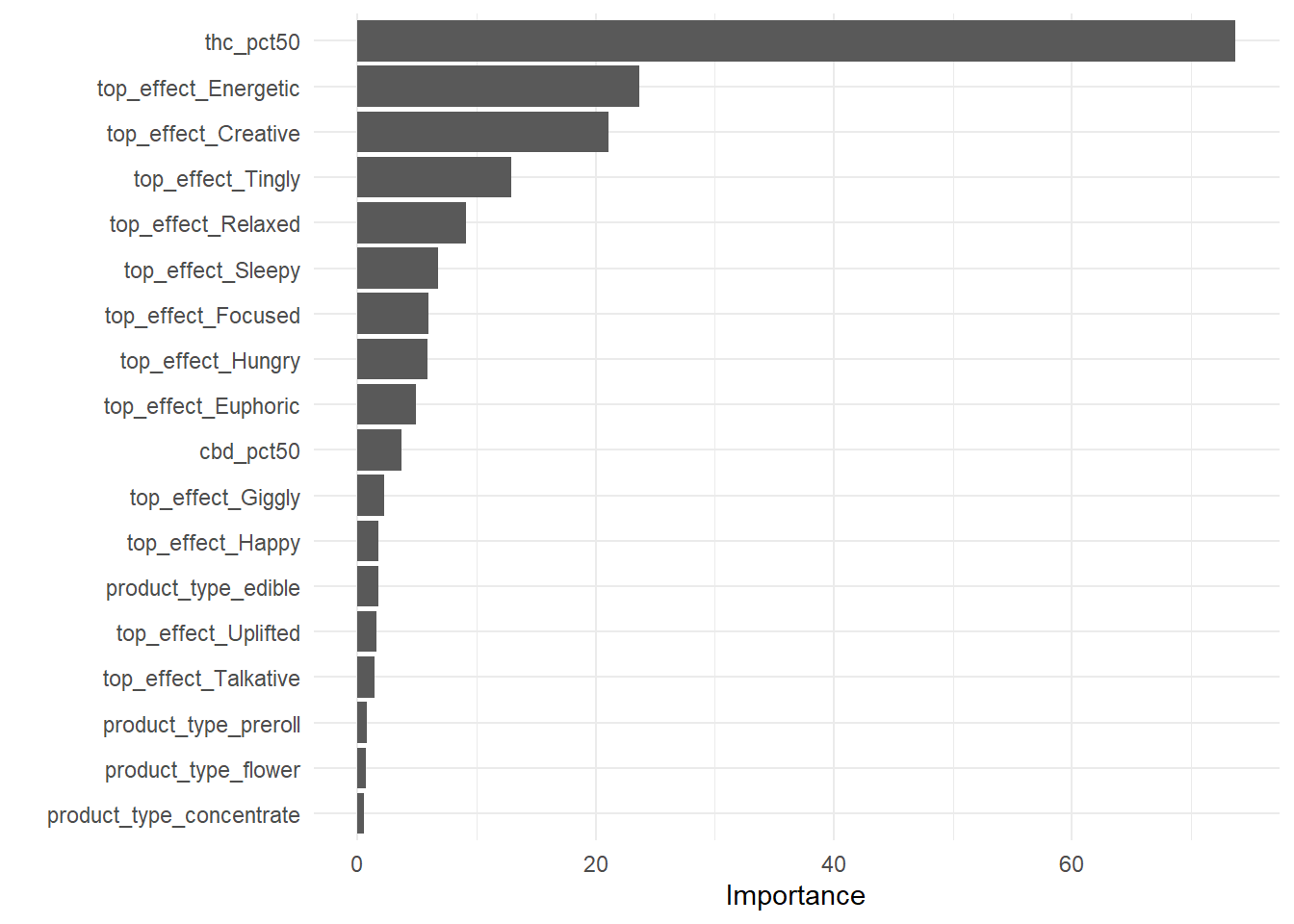 In the graph below, THC percent (q50) and strain effects such as energetic, creative, tingly, and relaxed were the top 5 contributors to rating a strain.
