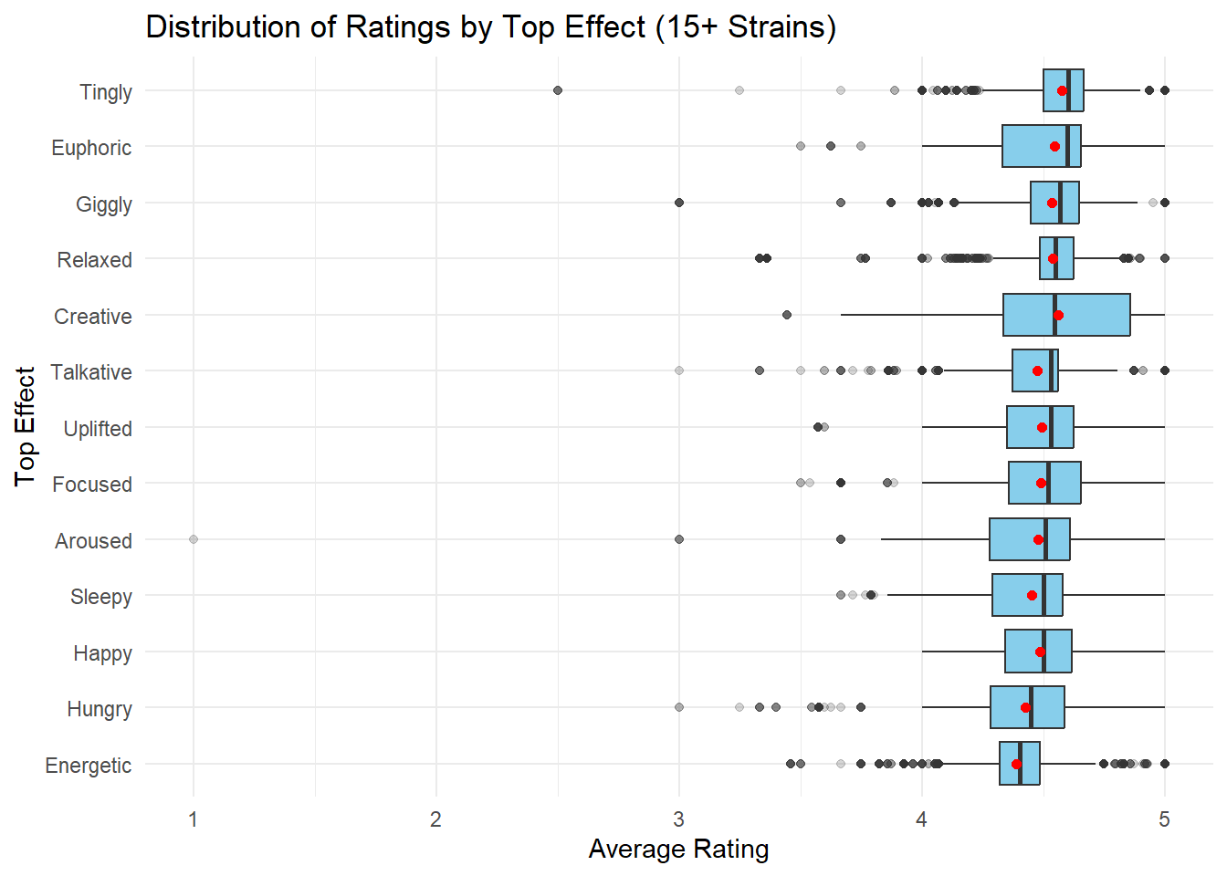However, effect categories explain relatively little total variance in ratings. Moreover, strains lacking an assigned top effect tend to perform worse, suggesting that metadata completeness itself may influence consumer perception, independent of chemistry.