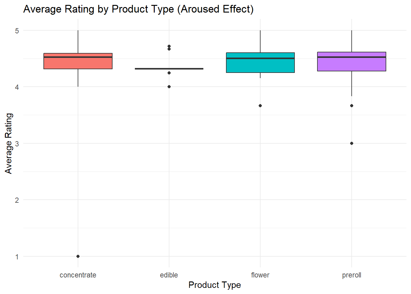 Product form matters less than chemistry. Average ratings are broadly similar across flower, prerolls, concentrates, and edibles once THC levels are considered.